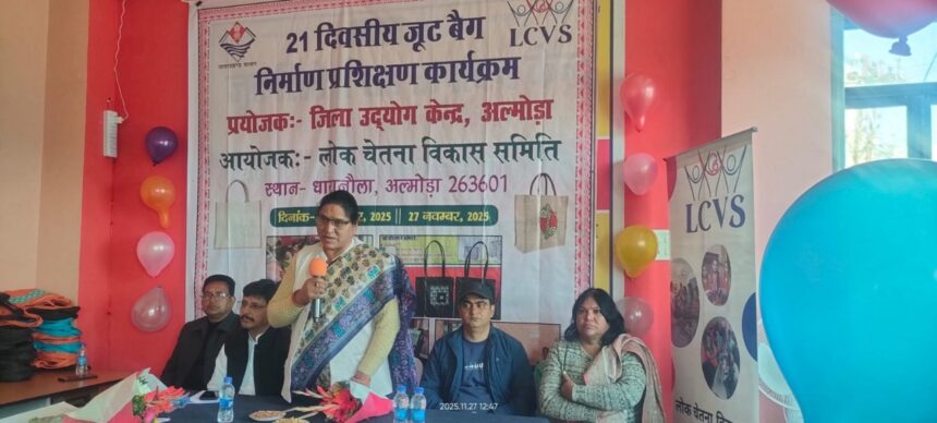 Chairperson of Lok Chetna Vikas Samiti, Dr. Kumud Chauhan, presented a future development model based on group participation, aimed at promoting the manufacturing of jute bags and related products in Almora with the support of trained women. She emphasized that such initiatives will continue to empower women and strengthen their livelihood opportunities.