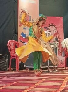 इंदर आर्या के गायन के साथ मंच पर अल्मोड़ा की प्रतिभाशाली कलाकाराएं पलक तिवारी और सांची वर्मा ने अपनी नृत्य प्रस्तुतियों से समा बांध दिया। पारंपरिक कुमाऊंनी परिधानों में सजी इन दोनों लोक नृत्यांगनाओं ने दर्शकों का मन मोह लिया। ताल, भाव और मुद्राओं की सुंदर प्रस्तुति ने हर किसी को लोकनृत्य की समृद्ध विरासत से रूबरू कराया। मंच पर जब इंदर के गीतों पर पलक और सच्ची थिरकीं, तो पूरा पंडाल तालियों की गूंज से गूंज उठा।