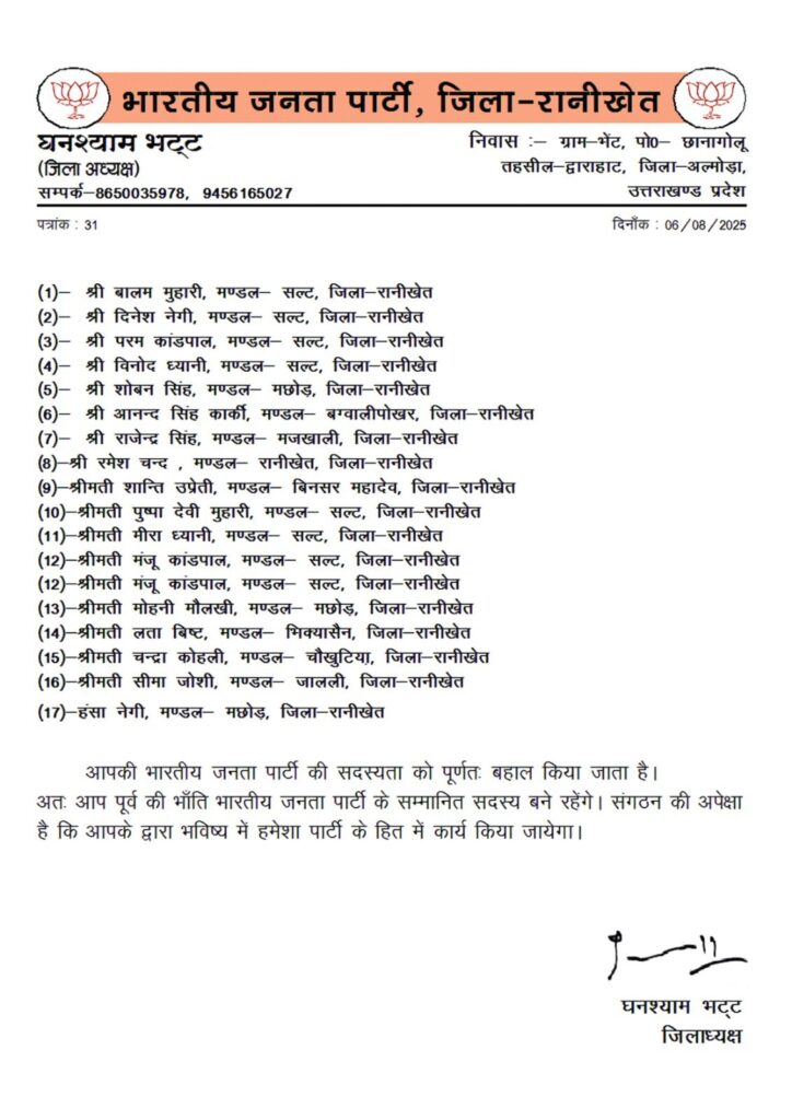 भारतीय जनता पार्टी, जिला रानीखेत द्वारा एक अहम संगठनात्मक निर्णय लेते हुए जिले के विभिन्न मंडलों से 17 पूर्व भाजपा सदस्यों की पार्टी सदस्यता को पूर्ण रूप से बहाल कर दिया गया है। इस आशय की जानकारी जिलाध्यक्ष घनश्याम भट्ट द्वारा जारी पत्रांक 31, दिनांक 06 अगस्त 2025 के माध्यम से दी गई।