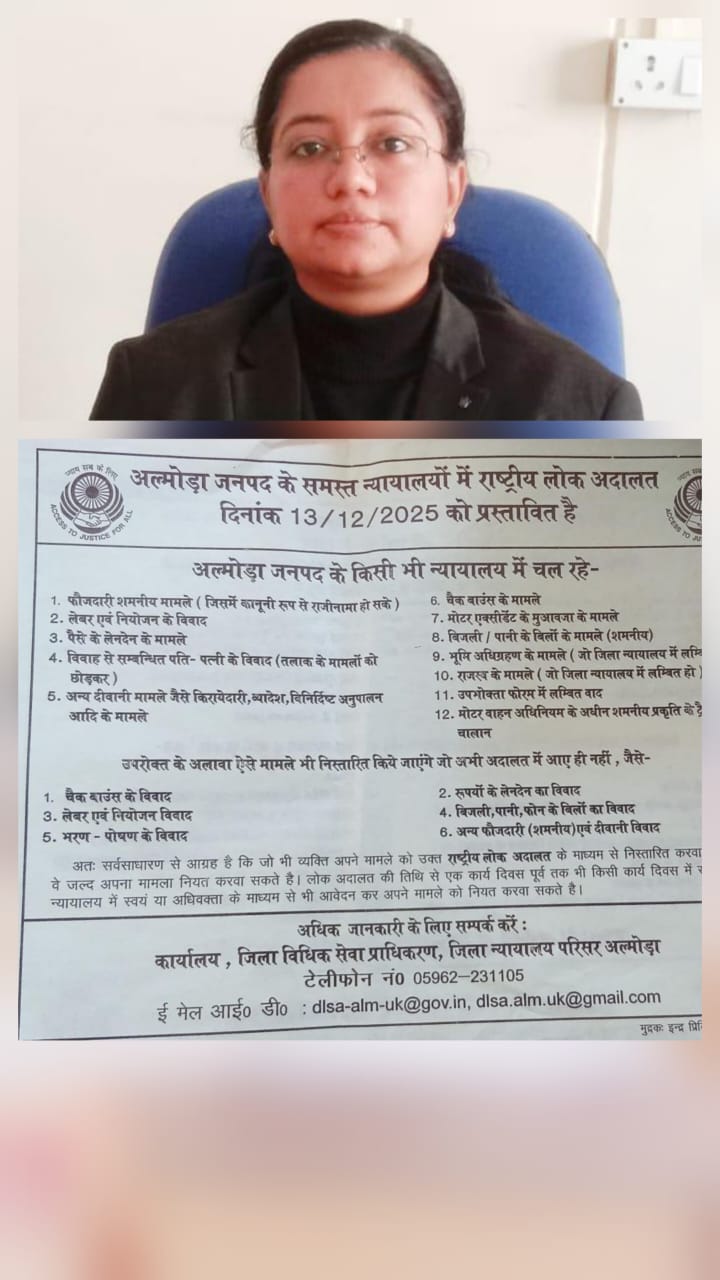 Almora. The National Lok Adalat is set to be organized on 13 December 2025 across all courts of district Almora. On this occasion, various cases will be settled through mutual compromise. The Secretary of the District Legal Services Authority (DLSA), Almora, Ms. Shachi Sharma, has appealed to litigants and the general public to take advantage of this opportunity. She informed that anyone wishing to settle their case through the National Lok Adalat may apply in the concerned court—either personally or through their advocate—till one working day prior to the scheduled date.